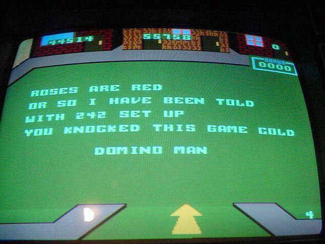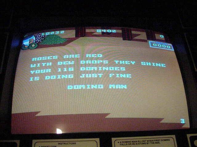 So what’s your story?I had to have this game! I didn't play it TOO much when it was out but that was due to the fact that it was only operated in one arcade in my area in the 80s. But whenever I was in Chucky Cheese, that's where you could find me. Popping quarters into Domino Man as this was the only chance I would get to play her, until I could find my way back (which wasn't too often) to Chucky Cheese. Domino man has a great soundtrack of the Maple Leaf Rag that plays as you set up your dominos, and the Maple Leaf Rag, as well as piano ragtime in general, has always moved me. So its no wonder that even the soundtrack pulled me in. Another interesting quirk to the game is the way each game ends. After the game is over, the game will have a poem displayed on the screen to evaluate the player's performance on the game. For example: