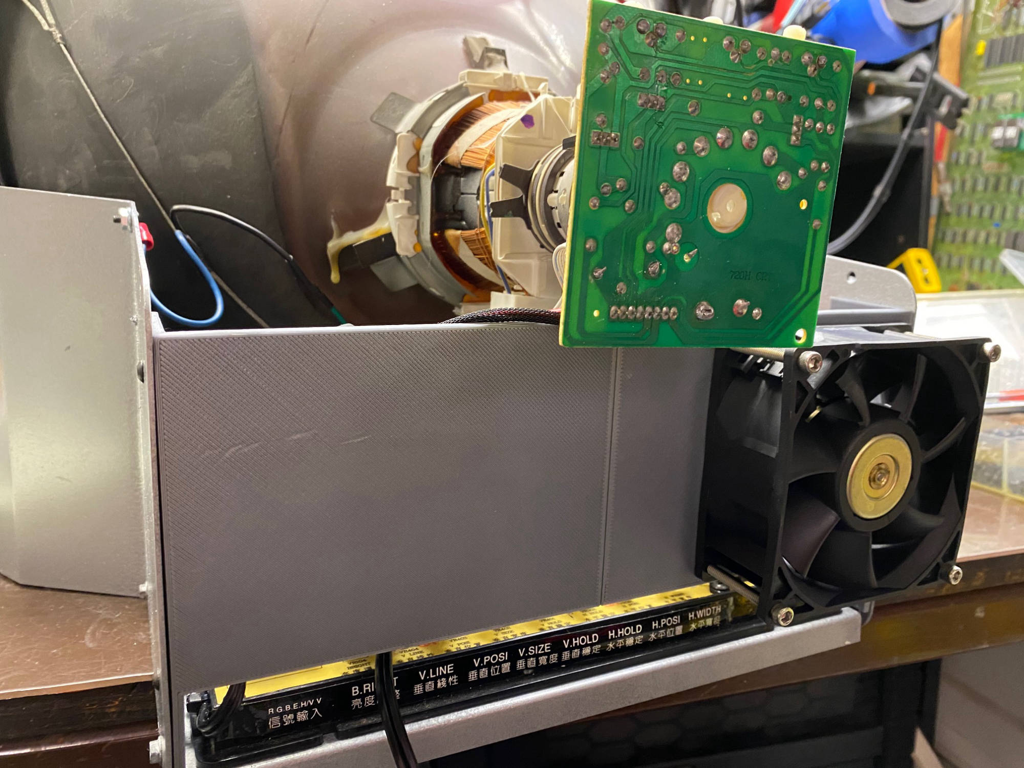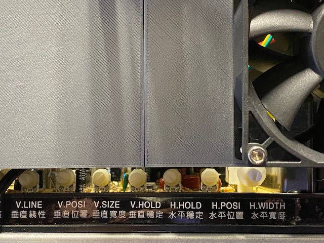 This frame adds a tiny power supply and a large fan to blow over the face of the monitor chassis. Although it’s main design purpose was to cool the universal monitor board, I’m sure a stock 7000 board would be happy to receive extra airflow too. The frame is raised to allow access to the adjustment Pots of the Universal Chassis board as shown in the last picture.