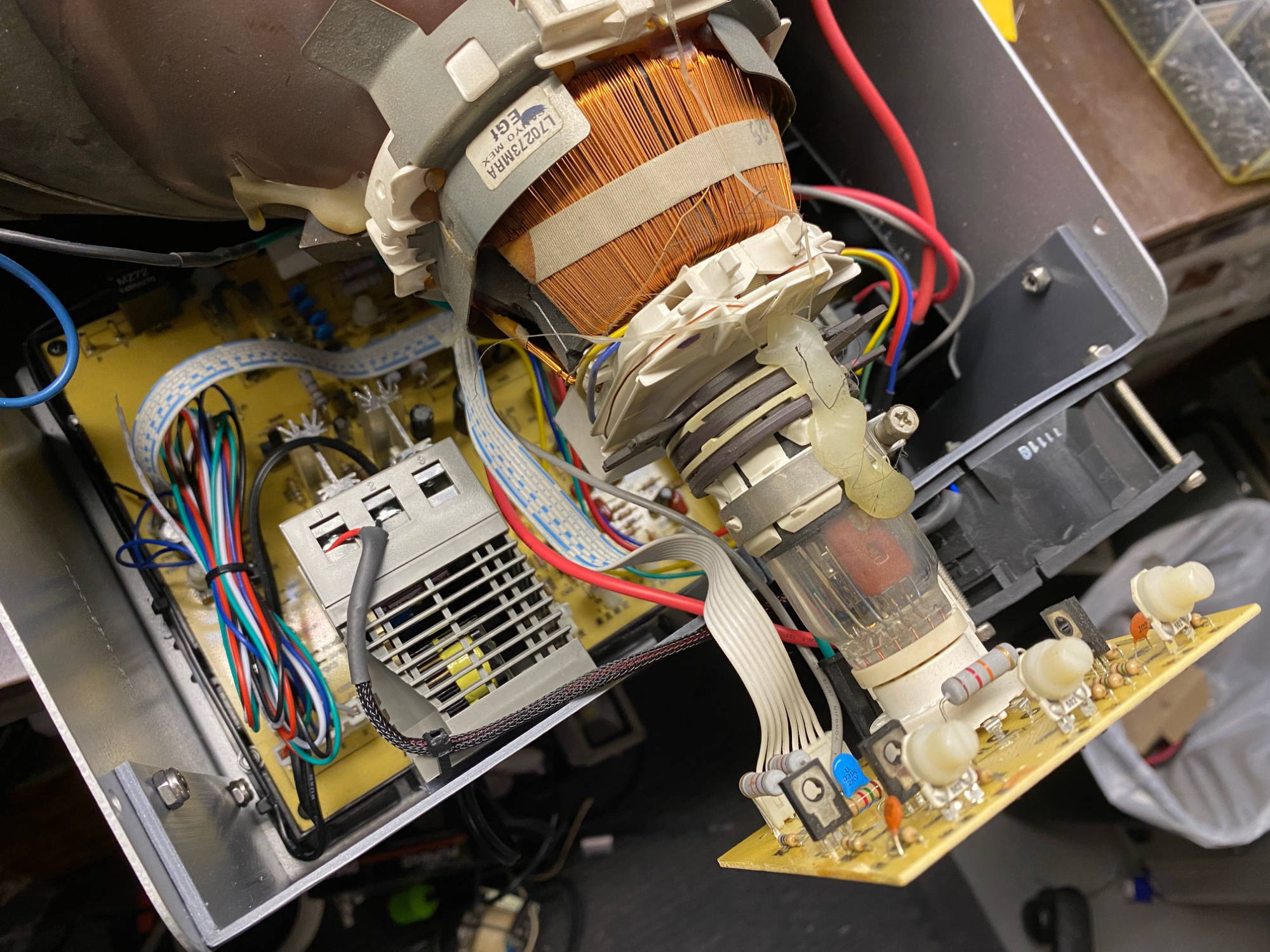 Since tubes are so hard to come by, I will save the frame of any arcade monitor I can get my hands on.. In this case, this Wells Gardner 19 inch K 7000 series frame was re-purposed using a Universal Arcade Monitor Chassis Monitor Board, and a re-purposed TV tube. Unfortunately, thermal images show that parts of the universal chassis run very hot. Especially that main power resistor.