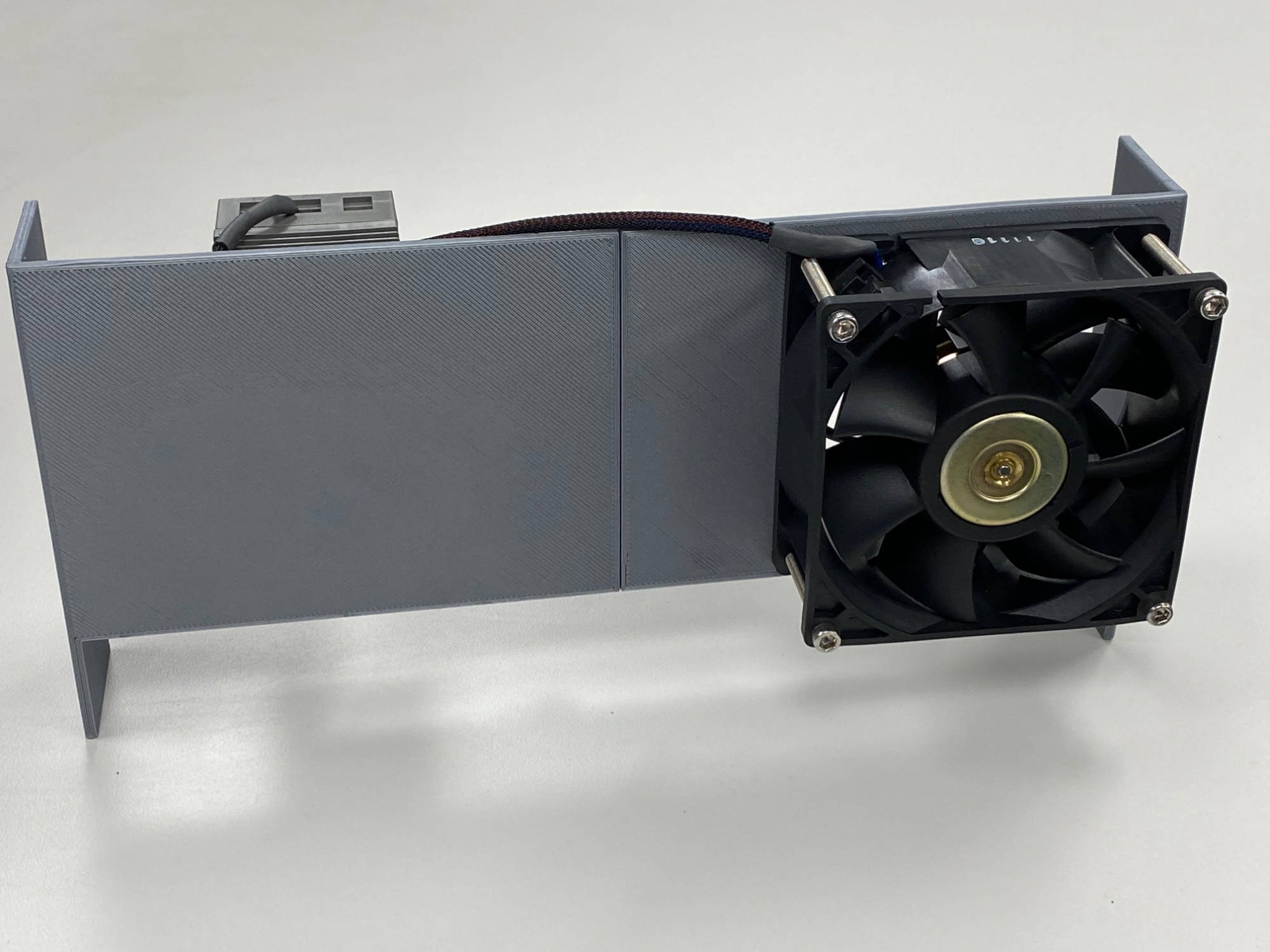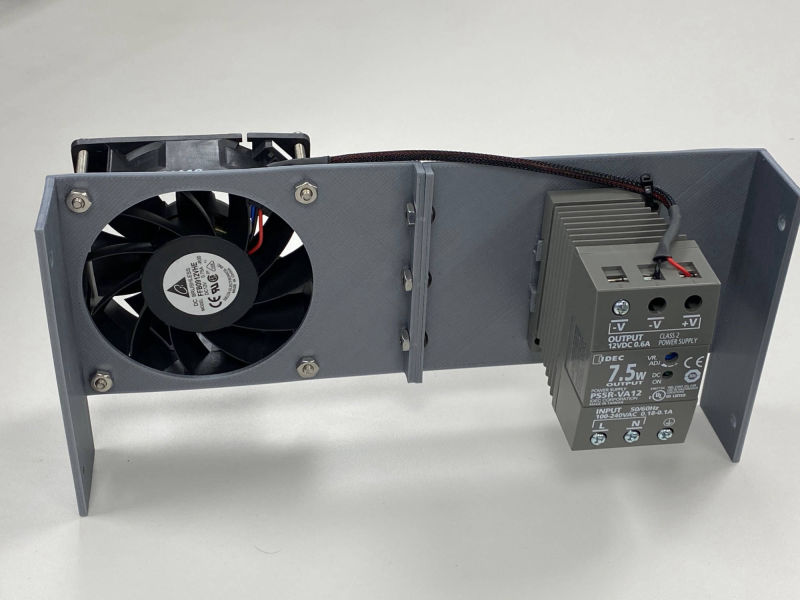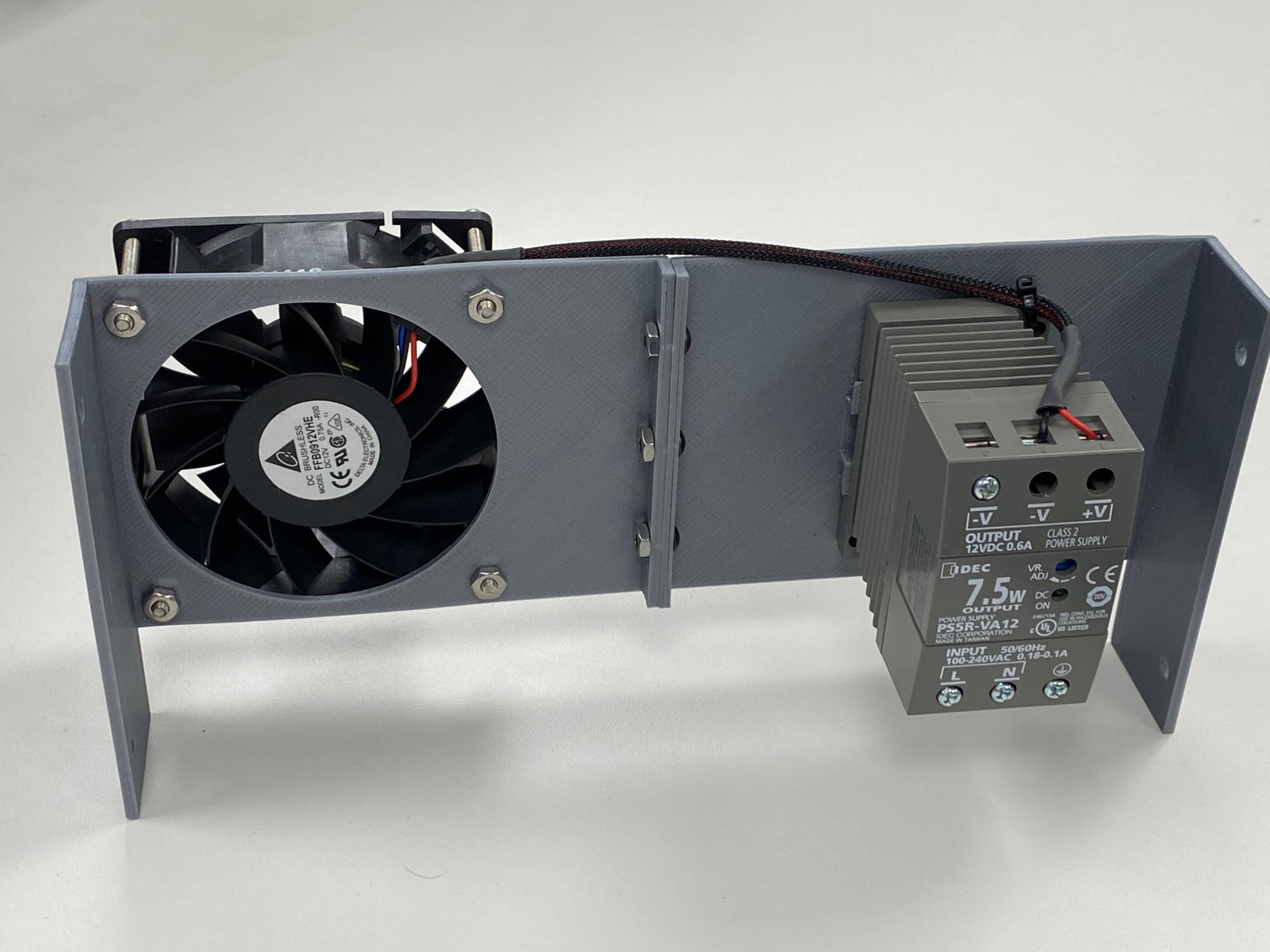 Bolt 2 half’s together using the 8-32 x 3/8 bolts. Use 8-32 X 1 ¾ to secure the fan. Snap Power Supply to DIN rail. Attach assembly to monitor frame and wire fan to 12 volt supply and supply to AC as you see fit.